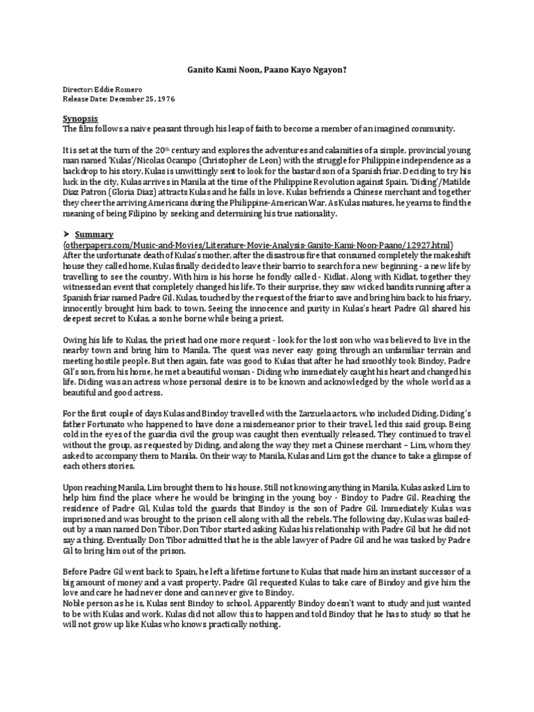 3122019 Ganito Kami Noon Paano Kayo Ngayon is a film that effectively depicts the struggle of Philippine independence and the life of an ordinary boy trying to explore and discover more of the country. Edicin dos premios mais finalmente non foi nomeado. The movies setting is in the Spanish-colonization era of our country.