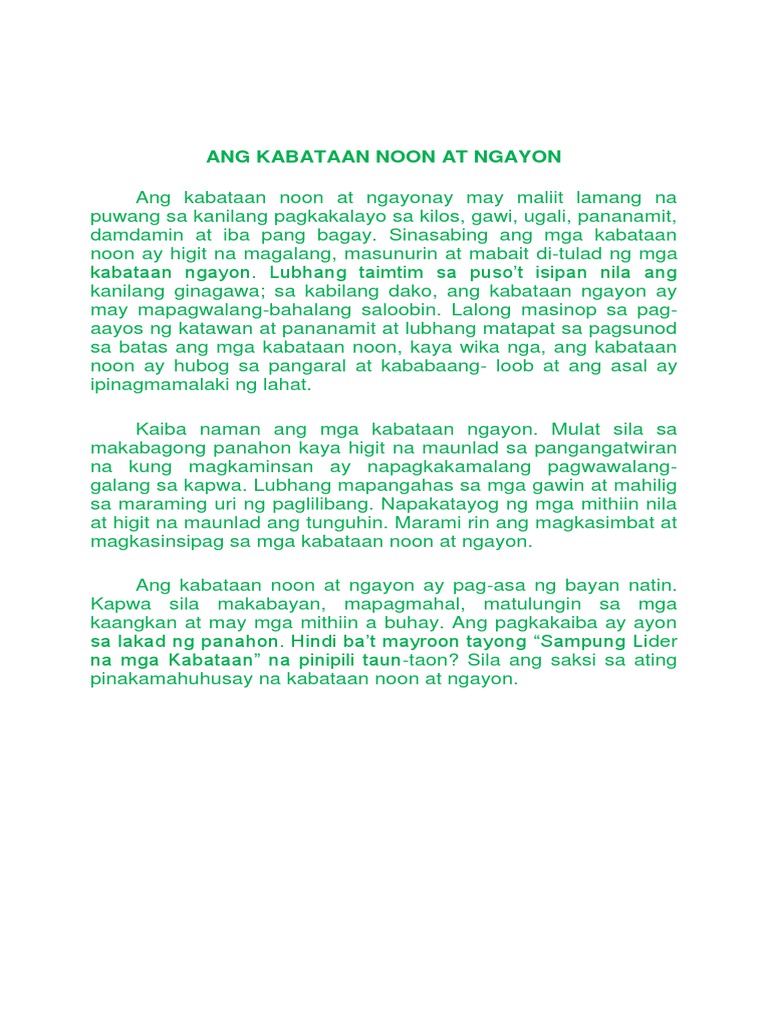 At Kung minsan pa ay nag dadalawang isip kung kabataan pa ng aba ang pag asa ng bayanAng kabataan noon at ngayon ay may maliit lamang na puwang sa kanilang pagkakalayo sa kilos gawi ugali pananamit damdamin at iba pang bagay. 10022020 10022020 Kishura Teleworking essay comments to post Kabataan noon at ngayon essay. Essay - Pilipinas Noon Ano na ngayon.
