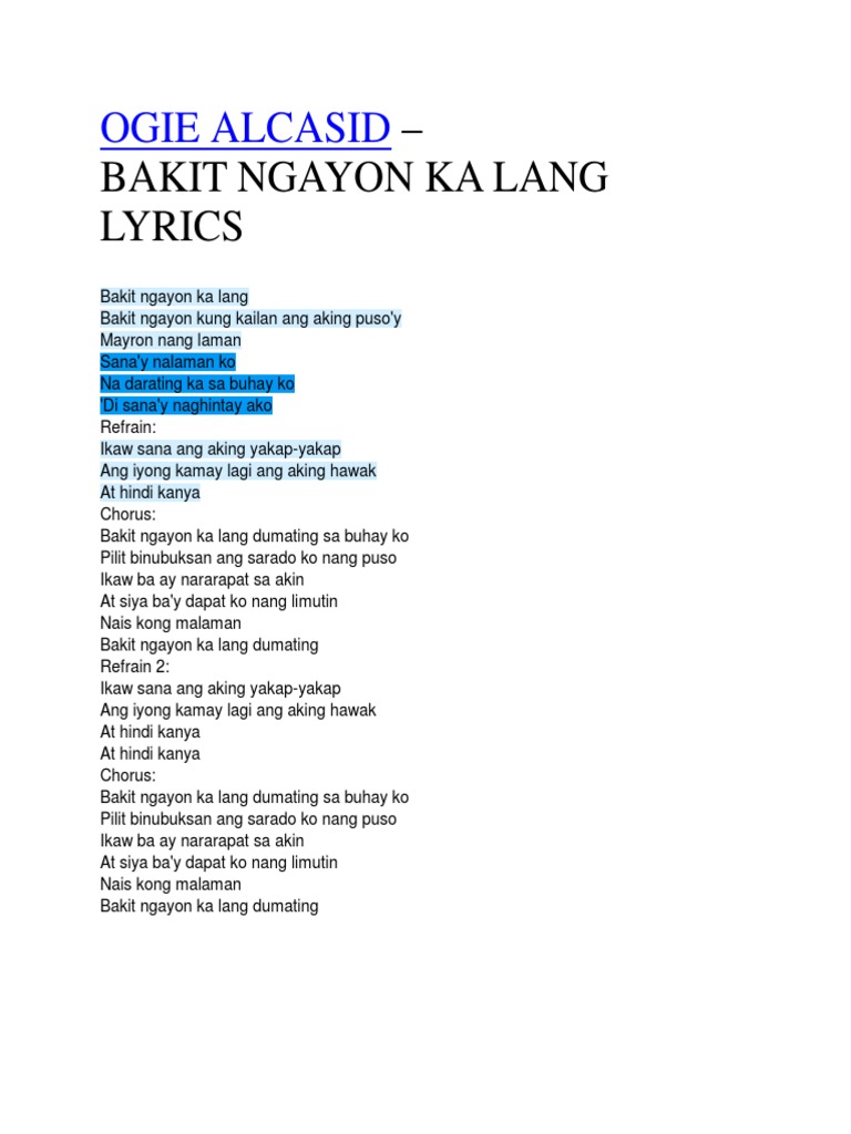 Weve found 166 lyrics 39 artists and 44 albums matching bakit ngayon ka lang by ogie. Bakit ngayon ka lang dumating sa buhay ko Pilit binubuksan ang sarado ko nang puso Ikaw ba ay nararapat sa akin At siya bay dapat ko nang limutin Nais kong malaman Bakit ngayon ka lang dumating. Bakit ngayon ka lang Bakit ngayon kung kailan ang aking pusoy Mayron nang laman Sanay nalaman ko Na darating ka sa buhay Di sanay.