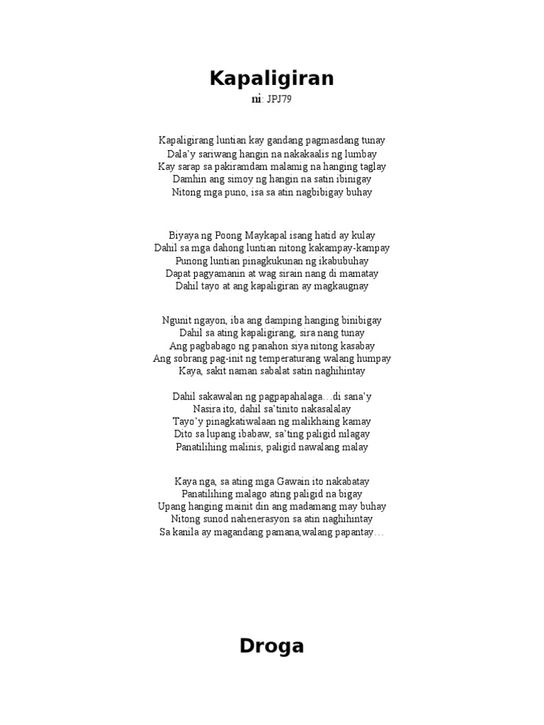 About Press Copyright Contact us Creators Advertise Developers Terms Privacy Policy. Sa paksa mapapansin sa kanilang kabuuan na ang paksang ginagamit ay karaniwang tumatalakay sa pag-ibig o personal na bagay sa buhay. Kung ikukumpara natin ang kalikasan noon at ngayon mapapansin natin ang ilang pagbabago na nagaganap sa ating kapaligiran.