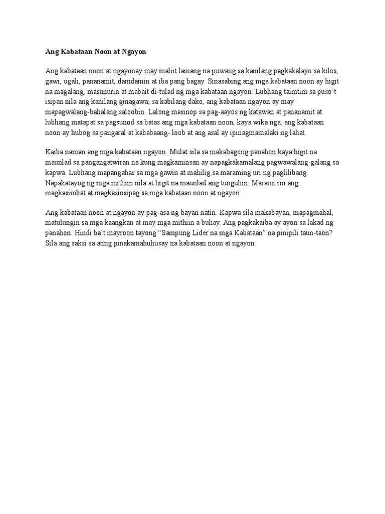 Kung ang hanap mo ay maikli o mahabang halimbawa tiyak na marami kang mababasa dito. Laging sinasabi ng ilan na ito ang madalas na pamanang iiwan ng ating mga magulang. Kabataan ng Makabagong Henerasyon.